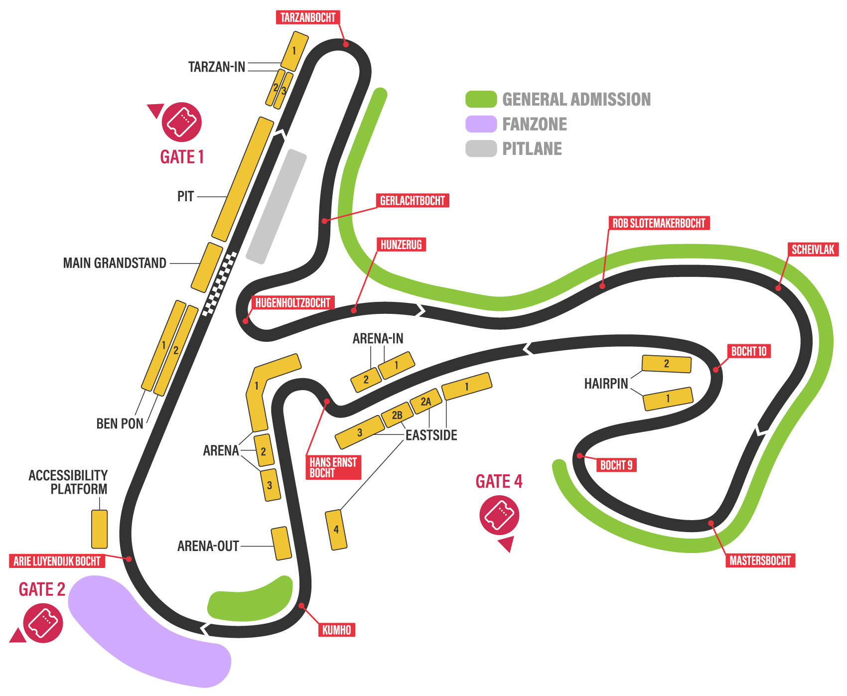De Grandstands Arena biedt niet het beste uitzicht op het circuit, maar de sfeer maakt dat ruimschoots goed. Bereid je voor op een zee van oranje fans die voor een luidruchtige en unieke sfeer zorgen! Als de auto's het einde van de ronde naderen, gaan ze door een langzame chicane omringd door pulserende tribunes.